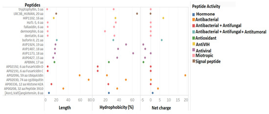 Figure 3 also shows the comparison of three physicochemical parameters, the length of the sequence, its net charge, and percentage of hydrophobicity. In general, it is confirmed that these peptide lengths varied between 5 and 20 residues, with a net charge running between −5 and 6. It is also noteworthy that the variation of hydrophobicity was wide, ranging between 5% and 60%. By type of activity, myotropic peptides had a net charge of 0 with lengths of 5 and 6 aa. The antivirals were anionic, with hydrophobicity between 40% and 60%, while those with antibacterial activity were mostly cationic with varying lengths and hydrophobicities.