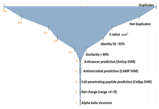 The funnel diagram was used to reduce the number of peptides and obtain the candidate peptides for chemical synthesis (Figure 4). Here, 904 peptide sequences were obtained and subjected to duplicate elimination, which reduced the number of peptide candidate to 699. However, the number of sequences remained very high. Therefore, the E-value was made more restrictive, from 1 × 10−3 to 1 × 10−4, which resulted in 375 peptides. At this point, the resulting peptides were aimed at the cationic helical antibacterial–anticancer (ABC) peptides not reported in the literature.