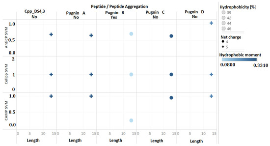 Comparison of physicochemical parameters (net charge, aggregation, hydrophobicity, hydrophobic moment, and length) and SVM prediction between pugnins and peptide Cpp_DS4.3. AntiCP = anticancer SVM prediction, Cellpp = cell-penetrating activity SVM prediction, and CAMP = antimicrobial SVM prediction. +: net charge +5. Blue point: net charge +4.