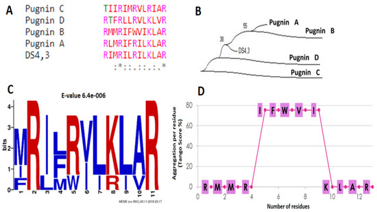 (A) Alignment between the pugnins of B. pugnax and the DS4.3 peptide. (B) Phylogenetic tree of the pugnins of B. pugnax and the DS4.3 peptide using neighbor-joining algorithm with the Bootstrap method with 1000 replicates. (C) Motif found between the pugnins of B. pugnax and the DS4.3 peptide. (D) Aggregation profile of pugnin B using the TANGO algorithm [] with the following parameters: 37 °C, pH 7.2, and ionic strength 0.02 M.