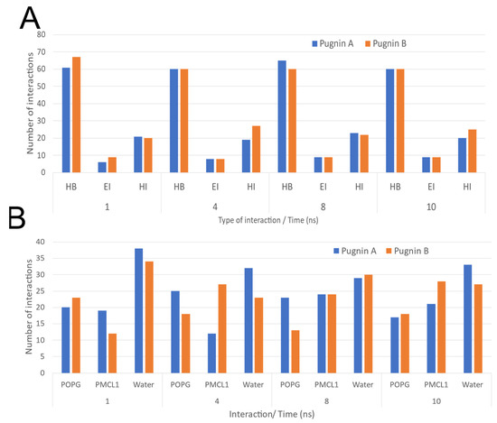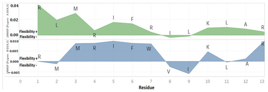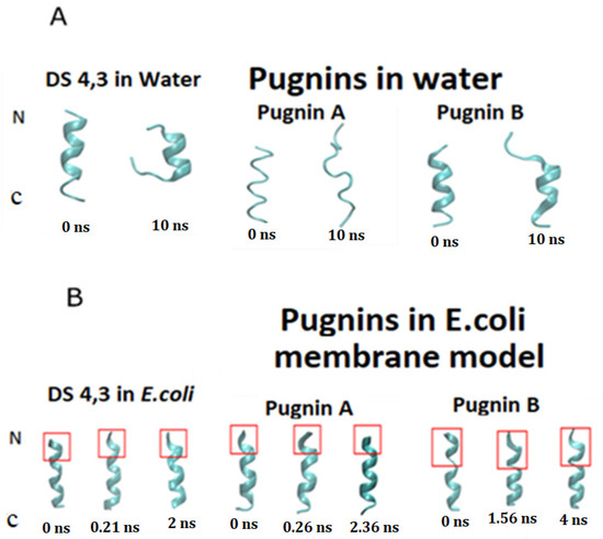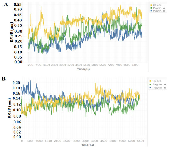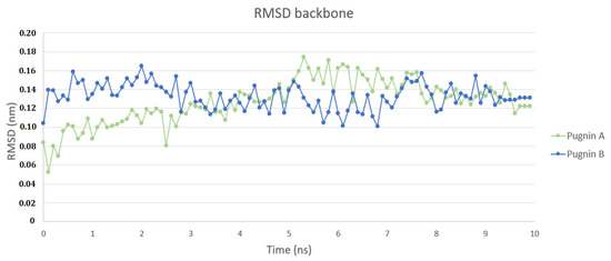 Once the system is balanced at the desired temperature and pressure: We execute the molecular dynamics (MD) of production for data collection for 10 ns. For molecular dynamics, an unbound limit of 12 Å was used simulating for 10 nanoseconds. The sum of Particle Mesh Ewald (PME) was applied to correct long-range electrostatic interactions []. The bonds containing hydrogen atoms involved were restricted using the SHAKE algorithm to their minimized energy values [], which allowed a numerical integration time step of 2 fs to be used in the simulation []. The helical structure has structural importance for antibacterial activity; therefore, to determine the stability of this structure during the 10 nanoseconds ns or 10,000 ps, Visual Molecular Dynamics (VMD) were used [] and GROMACS []. In the VMD analysis, the secondary structure during the simulation time was determined using the STRIDE algorithm []. To work with GROMACS (Version 2019.3), the .dcd format generated by NAMD were converted to .xtc using MDTRAJ [], with the “mdconvert” command. Subsequently, the root mean squared deviation (RMSD) of the backbone of the peptide (backbone) and the RMSF (root mean squared Fluctuation) per residue were obtained using the gmx rms and gmx rmsf commands. For the flexibility analysis, the ∆RMSF (nm) was made, making the difference between the RMSF of the pugnin and the RMSF of the original DS4.3 peptide. The interaction analysis was performed with the Discovery studio visualizer software (http://accelrys.com, accessed on 12 April 2019) to find the amino acids that interact with the molecules.
