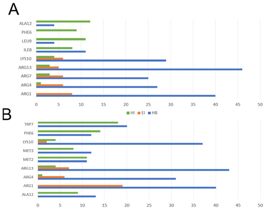 Added to these filters were attached two final filters, the net charge between +4 and +9 so that they had a powerful antibacterial activity and little hemolysis [,,]. The last filter was the helix structure, since peptides with ABC activity have this structure linked to membrane stability and antimicrobial potency [,].