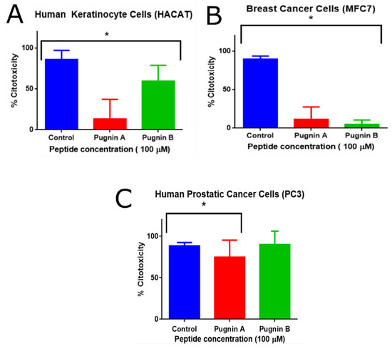 The cells used for the test were HaCaT, PC3, and MFC7. The cells were seeded in a 96-well plate at a density of 10,000 cells/well and cultured with the pugnin peptides A and B, at the concentrations of 100 µM, 33.33 µM, 11.11 µM, 3, 7 µM, and 1.23 µM until 24 h. Then, 10 μL of MTT solution (5 mg/mL, Sigma) were added to each well and incubated at 37 °C in 5% CO2 for 4 h. After centrifugation at 3000× g for 15 min, the supernatant was removed, and acid isopropanol (dimethylsulfoxide, Sigma) was added in the volume of 100 µL to dissolve the formazan crystals. The absorbance was measured at 570 nm using a microplate reader (Varioscan Flash, Thermo). For the negative and positive controls, erythrocytes in PBS and erythrocytes with Triton X-100 at 1%, respectively, were used.