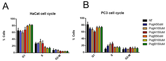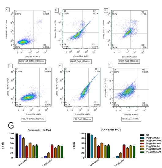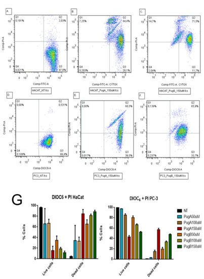 To determine variations in mitochondrial membrane potential and cytoplasmic membrane damage, HaCaT and PC3 cells were analyzed using DiOC6 (Molecular Probes D273) and propidium iodide (PI) (Sigma P4170). The cells were suspended in 500 μL of PBS containing 5 μL of 10 μM DiOC6 and 5 μL of 1 mg/mL of PI, and then the cell suspensions were incubated in the dark at room temperature for 20 min, washed, resuspended in PBS, and analyzed by flow cytometry (BD LSR Fortessa). The concentrations of pugnin A and B peptides were 50, 100, and 150 μM, with three repetitions [].