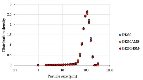 Particle size distribution density of the raw material in comparison to processed powders without the additive. n = 3, error bars show SD.