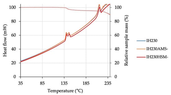 Results of DSC analysis of the raw material in comparison to processed powders without the additive. The secondary y-axis shows the relative mass decrease (dotted lines). n = 3. Negligible variation between the compared data series results in overlapping curves.