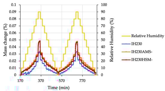 DVS plot showing relative mass change related to the reference mass in dependence of the relative humidity. Sample conditioning data (0–170 min) are not shown.