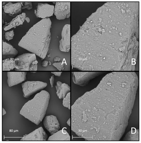 SEM images showing IH230AMS+. (A,B) Before and (C,D) after removing residual particles via air-jet sieving. (A,C) In 1000× magnification and (B,D) in 2500×. magnification.