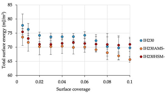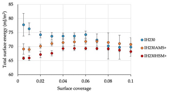 Another technique, which was used to investigate the processing and coating process impact, was inverse gas chromatography. The measured surface energy can be plotted over the surface coverage. Since the surface energy is derived from chemical composition and physical properties, such as crystal habit, it is perfectly suitable for the investigation of particle coating processes. Prior to every measurement of surface energy, an octane adsorption isotherm was performed to calculate BET surface area (Table 2), which was then used to determine monolayer capacity. With known monolayer capacity, all injections of probe gases are comparable since specific surface coverages are injected instead of injecting fixed concentrations (leading to different surface coverages). In Table 4, the range of the different components of the surface energy of solids (i.e., dispersive and acid-base part) of the starting material IH230 and all processed materials are displayed. The total surface energy of solids (right column) is calculated as the sum of both parts. The surface energy is dependent on the surface coverage because at low surface coverages, the probe gases will primarily interact with high energy sites on the sample. With increasing surface coverage, more sites are taken into account. Usually, measurements would not be performed above 20% of the monolayer capacity because probe gas molecules start to interact with each other at higher concentrations [].
