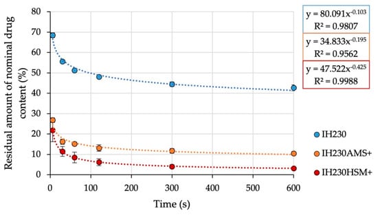 Residual amount of nominal drug content of respective interactive blends (percentage of nominal drug content) in dependence of the time dispersed by the AJS. n = 3, error bars show SD.