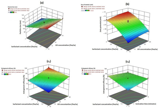 3D surface plot for the effect of oil concentration (%), surfactant concentration (%), and sonication time on (a) particle size, (b) zeta potential, and (c1,c2) entrapment efficacy (%). Oil concentration and surfactant concentration had a significant effect on particle size, zeta potential, and entrapment efficacy, while sonication time also showed an interactive positive effect on entrapment efficacy.