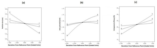 Particle size of colloidal lipoid systems is a complicated process as it is affected by types of lipid and/or surfactant used, their amounts and relative ratios, also can be controlled by applied formulation conditions of homogenization and/or sonication speed and time [77]. The results presented in Table 2 and illustrated in Figure 1A show that the PS was in the range of 103.46 nm (F10)–159.78 nm (F6). The effect of A, B, and C on particle size was quantitively described by the following polynomial regression equations for linear model: