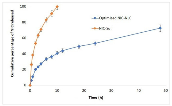 A 1 mL sample of each optimized NIC–NLC formula (equivalent to 10 mg NIC) and NIC–Sol (10 mg) was separately placed into a dialysis bag (12 kDa-MWCO, 2.4 nm pore size) hydrated by soaking in SNF for 24 h before use. These bags were directly immersed in (200 mL) SNF, to maintain sink conditions, maintained at 37 ± 0.5 °C and stirred at 50 rpm. At predetermined time intervals, 3 mL sample aliquots were withdrawn (with replacement with fresh SNF) for 6 h and analyzed for their drug content using an HPLC assay method [63]. The mean of six determinations was considered.