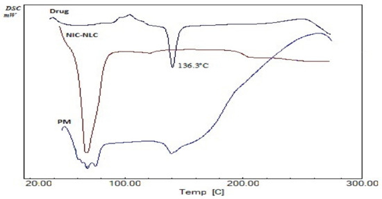 Samples (2–4 mg) of NLC–NLC, plain NIC, and physical mixture (PM) were separately transferred into an aluminum pan of differential scanning calorimeter (Perkin–Elmer DSC4, Boston, Massachusetts, USA), and continuously purged by a constant rate of 10 °C/min over a temperature range of (30–300 °C) against a blank under nitrogen gas, and thermograms were compared.