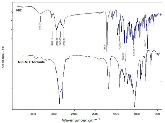 To test for any possible interactions between formula components, samples (2–4 mg) of NIC–NLC formulas and plain NIC were scanned by IR spectrophotometer (Shimadzu IR-435, Kyoto, Japan) in the range of 4000–500 cm−1 after compression with dry potassium bromide. The IR spectra were analyzed.