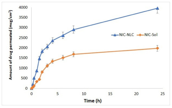 Permeation ability of the prepared NIC–NLC in comparison to NIC–Sol through nasal mucosal membrane was studied on sheep nasal mucosa (Rahmani, 7 months age, 30 Kg) using modified Franz diffusion cell. The intact membrane was carefully separated, cleaned, and stored in PBS (pH 6.4) at 4 °C until use [66].