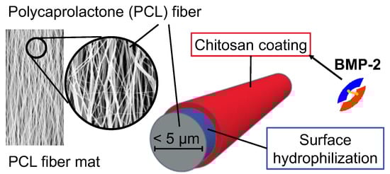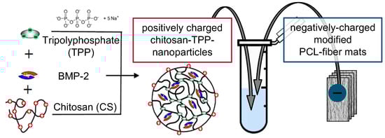 - Sundermann, J.; Oehmichen, S.; Sydow, S.; Burmeister, L.; Quaas, B.; Hänsch, R.; Rinas, U.; Hoffmann, A.; Menzel, H.; Bunjes, H. Varying the sustained release of BMP-2 from chitosan nanogel-functionalized PCL fiber mats by different PCL surface modifications. J. Biomed. Mater. Res. A 2021, 109, 600–614. [Google Scholar] [CrossRef]