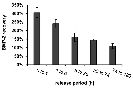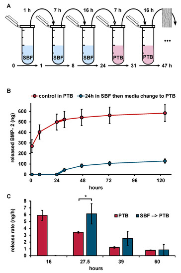 In order to distinguish whether BMP-2 release into the SBF medium was reduced or whether BMP-2 was released but could not be recovered from the release medium, an additional release test with a change from SBF to PTB after 24 h was performed (Figure 4).