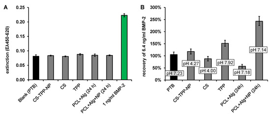 In contrast, the recovery of 6.4 ng mL−1 BMP-2, which had been added to the component solutions, was clearly influenced by the different additives (Figure 6B). Apart from the extraction samples (last two columns), the added components were significantly more concentrated than in the release samples, which is reflected in the deviating pH value in these samples compared to PTB. The different pH value in these samples (CS-TPP-NP, CS and TPP) may have had an additional effect on the ELISA recovery.