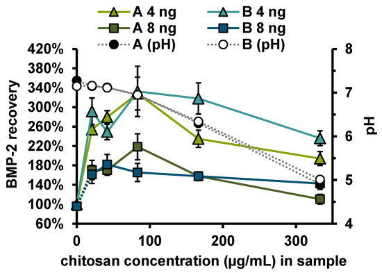Measurements in the extract from the alginate coated fiber mats (PCL + Alg (24 h)) showed a reduced BMP-2 recovery (57 ± 7%), while measurements in the extract from alginate + CS-TPP-NP coated fiber mats (PCL + Alg + NP (24 h)) indicated a strongly increased recovery (263 ± 19%). Accordingly, the increase in recovery was associated with CS or CS-TPP-NP. To investigate the influence of CS concentration on the recovery of BMP-2 in the ELISA, the recoveries of 4 and 8 ng/mL BMP-2 were determined in samples to which different amounts of chitosan (with or without TPP) had been added (Figure 7). Irrespective of whether TPP was additionally added, there was an increased recovery of approx. 272 ± 50% for 4 ng and of approx. 162 ± 30% for 8 ng BMP-2. No correlation between chitosan concentration or pH value and recovery was observed for the investigated chitosan concentrations between 21 and 333 ng mL−1.