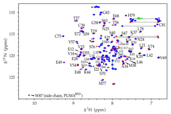 PUMA is a BH3-only protein (containing the Bcl-2 homology domain #3) of the Bcl-2 family that promotes apoptosis or programmed cell death [19]. Pro- and anti-apoptotic members of the Bcl-2 family participate in protein–protein interactions as a mechanism to regulate cell fate [26,27]. It is well known that the BH3 region is the active binding component of the proapoptotic proteins [28,29]. Thus, peptides comprising the BH3 domain are capable of binding and eliciting cell death [15]. In addition, it has been extensively reported that certain types of cancer cells are resistant to anticancer treatments due to mechanisms developed to impair apoptosis [30]. Therefore, BH3-derived peptides from proapoptotic members of the Bcl-2 family are intensively investigated as anticancer drugs [31]. The BH3 domain of PUMA is capable of binding the prosurvival protein Bcl-xL as a mechanism of antagonizing its function and thus promoting cell death [19]. However, PUMA is unique in that it is the only protein capable of destabilizing the interaction between Bcl-xL and the transcription factor p53 to induce cell death [32]. Once free, p53 activates proapoptotic Bax and Bak, which trigger apoptosis by mitochondrial outer membrane permeabilization [32]. The structure of the complex between PUMABH3 and Bcl-xL has been determined by NMR and the KD of the interaction is ~3 nM based on isothermal titration calorimetry [16].