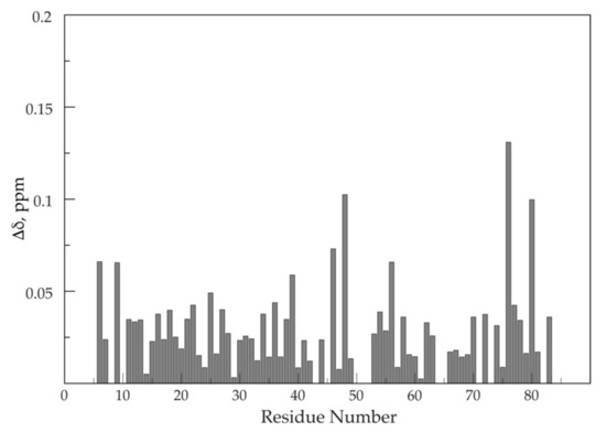 The combined amide 15N and 1H chemical shift deviations between sapC and sapC-PUMA versus the amino acid sequence are shown in Figure 5. Amino acids with side chains that can be protonated and deprotonated by slight changes in the solution pH might show larger deviations in amide chemical shifts due to the effect of the protonation state of the side chain (Figure 5). For example, Glu 48, is one of the signals with the largest chemical shift changes. Amino acids Pro 43 and Pro 71 are not observed because they lack the NH amide pair that gives rise to signal in [1H-15N]-2D NMR spectra. Several amino acids such as Gln 51, Glu 52, Ile 64, and Leu 65, could not be unambiguously assigned and are not shown. Altogether, the average chemical shift change observed is small (0.03 ± 0.02 ppm), indicating that conformational or structural changes in sapC by the presence of the PUMA peptide are negligible.
