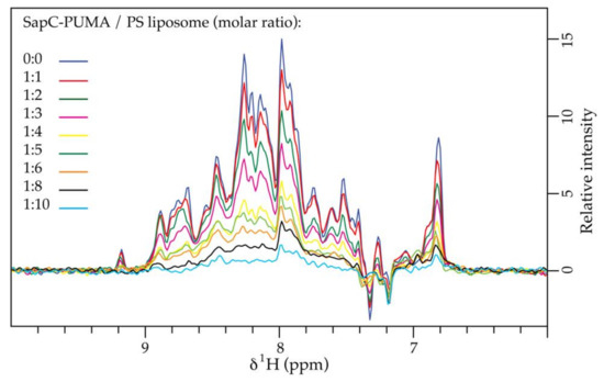 Based on the absence of structural changes in the sapC domain of the chimera, it is reasonable to expect that the function of sapC is also unmodified. To prove this hypothesis, we performed liposome binding assays with sapC-PUMA using NMR. For a better comparison to our previous work [9,10], these 2D NMR studies were performed under very similar conditions (absence of buffer for readily pH change to modulate sapC-liposome binding). However, sapC-PUMA titrations with liposomes were performed at pH 6.0, because of the higher solubility of the chimera at less acidic pH, and at increasing concentrations of PS liposomes due to the known preference of sapC for negatively charged lipids [7].