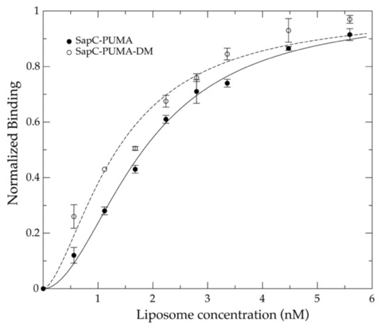 The mutant chimera (sapC-PUMA-DM) in which the electrostatic surface of the sapC domain is more positively charged due to mutations of Asp 55 and Glu 67 to Arg, is expected to bind with increased affinity to liposomes. We first checked using [1H-15N]-2D NMR that the saposin fold was not perturbed by the presence of the mutations in the sapC domain. Figure S2 (Supplementary Materials) shows an overlay of the spectra of sapC-PUMA and sapC-PUMA-DM, indicating minimal perturbations of the chemical shifts and a properly folded protein. The NMR titration of sapC-PUMA-DM with liposomes indicates that liposome binding is enhanced in the presence of additional positive charges in the surface of sapC, resulting in a value of KDapp ~1.6 nM at pH 6. Thus, the affinity of sapC-PUMA-DM for liposomes has almost doubled relative to wildtype sapC-PUMA (Figure 7).