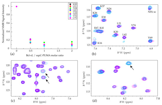 The spectrum at 0.5:1 molar ratio of Bcl-xL/sapC-PUMA displays two sets of signals for the PUMABH3 domain corresponding to populations of the unbound and bound conformations (signals of the bound conformation indicated by arrows in Figure 8c,d in magenta). These signals are not observed in the spectrum at 0:1 molar ratio (no bound population) and are still observed in the spectrum at 1:1 molar ratio (100% bound population). When the Bcl-xL/sapC-PUMA molar ratio is increased to 1:1 or 2:1, only one set of signals remains, which corresponds to 100% population of bound PUMABH3 (Figure 8c,d). Overall, these results indicate that the sapC-PUMA/Bcl-xL complex is 1:1 and that the exchange rate between the bound and unbound conformations of sapC-PUMA is slow on the NMR chemical shift time scale as two sets of signals are observed.