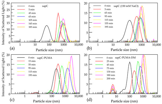 We have used dynamic light scattering to study liposome fusion orchestrated by sapC, sapC-PUMA, and sapC-PUMA-DM (all without His-tag) and its time dependence. For sapC, we observe that liposomes increase in diameter from ~100 nm to ~400 nm in approximately 5 min after protein addition and reach approximately 900 nm after 200 min (Figure 9a). After ~65 min, vesicles typically reach maximum size as larger vesicles are not observed at 200 min. It is important to indicate that liposome agglutination could also result in an increase in particle size from dynamic light scattering data. Liposome agglutination would likely result in particles of different size and polydisperse solutions. In contrast, we observed particle size uniformity at the end of the kinetic experiment. In addition, slight liposome leakage was observed in previous studies on liposome fusion mediated by sapC [7,8]. This result is expected for fusogenic processes that require deformation and breakage of the lipid bilayer, but it is not expected from agglutination processes. Thus, our dynamic light scattering results indicate increased liposome size due to fusion and not to agglutination.