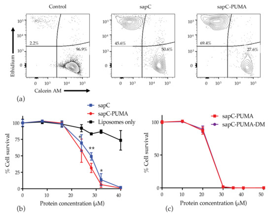 SapC-PUMA proteoliposomes enhance cellular toxicity relative to sapC: U-87 MG cells were cultured for 72 h in the presence of proteoliposomes composed of PS and different concentrations of sapC, sapC-PUMA, and sapC-PUMA-DM, or with liposomes alone (concentrations determined as described in the Materials and Methods section). Cell viability was analyzed by flow cytometry. Calcein AM+Ethidium— live cells from each treatment group were determined and cell survival was calculated relative to PBS control. (a) Representative flow cytometry plots of 28 µM protein treatment or PBS control. (b) Combined data from all protein concentrations. (c) sapC-PUMA and sapC-PUMA-DM proteoliposomes were compared for their effect on cell viability at the indicated concentrations. Data in panels (b,c) are from different experiments under the same experimental conditions except for slight variations in protein concentration. Data are from at least five replicates per group. Statistical analysis to compare sapC and sapC-PUMA was performed by Student’s t-test with * p < 0.05; ** p < 0.01.