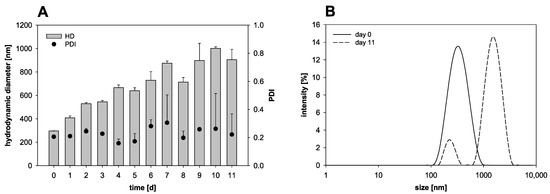 Nanocapsule stability over 11 days of storage (4 °C) in suspension: (A) Variation of the hydrodynamic diameter (HD) and the polydispersity index (PDI) (mean ± SD; n = 3) and (B) intensity weighted size distribution on day 0 and day 11.