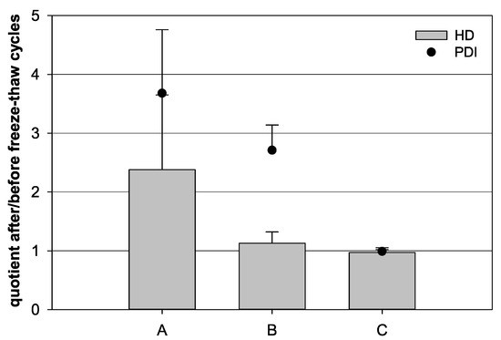 Influence of freeze–thaw cycles on the quotient of the hydrodynamic diameter (HD, bars) and the quotient of the polydispersity index (PDI, dots) before and after a freeze–thaw cycle, respectively. (A) 100 µL nanocapsule suspension with 900 µL purified water, (B) 1000 µL nanocapsule suspension, and (C) 100 µL nanocapsule suspension with 900 µL purified water and 3% (w/v) trehalose (mean ± SD; n = 3).