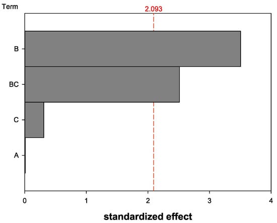 The influence of the parameters “shelf temperature for primary drying” (A), “trehalose content” (B), and “volume of nanocapsule suspension” (C) were analyzed. The shelf temperature (A) did not significantly influence the HD change (Figure 3). Therefore, the parameter (A) was not further analyzed and the shelf temperature was kept constant at −34 °C from now on. The volume of nanocapsule suspension (C) also did not display a significant influence on its own. Solely the trehalose content (B) and the interaction of the nanocapsule suspension volume and the trehalose content (BC) showed a significant influence on the HD variation after the lyophilization.