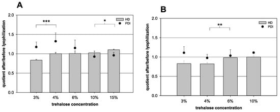 Influence of the lyophilization on the quotient of the hydrodynamic diameter (HD, bars) and the quotient of the polydispersity index (PDI, dots) before and after lyophilization, respectively. (A) 100 µL nanocapsule suspension + 900 µL purified water with various amounts of trehalose and (B) 1000 µL nanocapsule suspension with various amounts of trehalose (statistical test: two-tailed Student’s t-test; * for p ≤ 0.05, ** for p ≤ 0.01, *** for p ≤ 0.001; mean ± SD; n = 3).