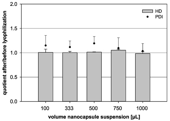 Influence of the lyophilization on the quotient of the hydrodynamic diameter (HD, bars) and the quotient of the polydispersity index (PDI, dots) before and after lyophilization, respectively. Different volumes of nanocapsule suspension were combined with a fixed trehalose content of 6% (w/v) (statistical test: one-way ANOVA; no significance between the compared groups regarding the HD quotient; p = 0.326; mean ± SD; n = 3).