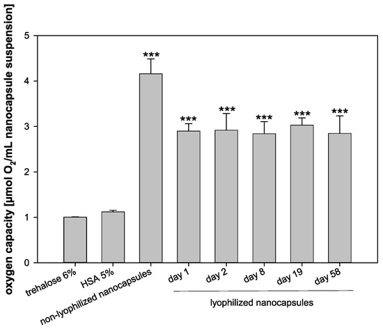 Oxygen capacity of trehalose 6%, HSA 5%, non-lyophilized nanocapsules on day 0, and lyophilized nanocapsules on days 1, 2, 8, 19, and 58, respectively (statistical test: one-way ANOVA; *** for p ≤ 0.001 compared to controls; mean ± SD; n = 3).