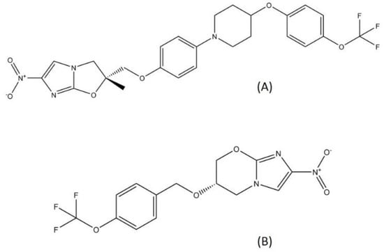 Although the existence of the nitro group in a compound is usually translated into the mutagenic profile, delamanid and pretomanid did not exhibit mutagenicity characteristics in preclinical and clinical trials [,]. From a study, it has been concluded that the position of each substituent surrounding the nitro group has a prominent role in determining the mutagenic characteristics [] of a nitroimidazole compound. Furthermore, the study discovered a novel class of nitroimidazole, i.e., benzothiazole-based compounds, that are non-mutagenic [].