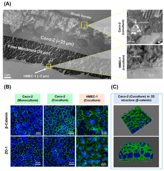 (A) Cross-sectioning images of Caco-2 and HMEC-1 coculture layers under TEM (left) and zoomed cross-sectioning images of the junction area between Caco-2 cells (upper right) and HMEC-1 cells (lower right); (B) immunofluorescent staining images of Caco-2 monoculture, cocultured Caco-2 and cocultured HMEC-1 layers, characterized by confocal microscopy for the expression of tight junction protein ZO-1 (Alexa Fluor® 488, green) and adherens junction protein β-catenin (Alexa Fluor® 488, green). The images are overlayed with cell nuclei (DAPI, blue); (C) the 3D images show only the expression of β-catenin in the cocultured Caco-2 layer and revealed a confluent monolayer with no cell stacking.