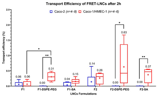 Transport efficiency of six FRET-LNCs formulations after 2 h in the Caco-2 model (blue, n = 4–8), and the Caco-2/HMEC-1 coculture model (red, n = 4–6). The (+) symbols represent the arithmetic mean, and the whiskers represent a 95% confidence interval (Kruskal–Wallis: * p ≤ 0.05, ** p ≤ 0.01).