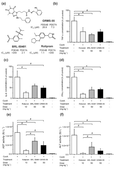 - Gantner, F.; Kusters, S.; Wendel, A.; Hatzelmann, A.; Schudt, C.; Tiegs, G. Protection from T Cell-Mediated Murine Liver Failure by Phosphodiesterase Inhibitors. J. Pharmacol. Exp. Ther. 1997, 280, 53–60. [Google Scholar]