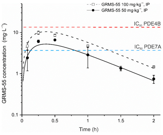- Świerczek, A.; Pociecha, K.; Ślusarczyk, M.; Chłoń-Rzepa, G.; Baś, S.; Mlynarski, J.; Więckowski, K.; Zadrożna, M.; Nowak, B.; Wyska, E. Comparative Assessment of the New PDE7 Inhibitor—GRMS-55 and Lisofylline in Animal Models of Immune-Related Disorders: A PK/PD Modeling Approach. Pharm. Res. 2020, 37. [Google Scholar] [CrossRef]