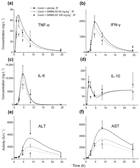 3.4. Influence of GRMS-55 Administration on the Release of Other Relevant Cytokines in ConA-Induced Hepatitis