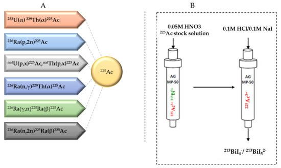(A) Production routes for 225Ac and (B) the 225Ac/213Bi generator.