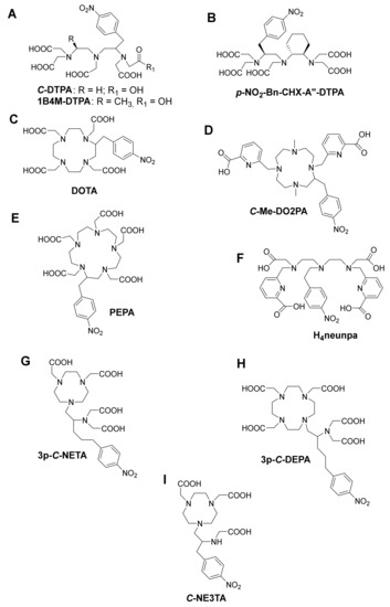 Me-DO2PA (Figure 4D), a [12] aneN4 bearing two picolinic acid arms and two methyl-capped amines, has also been reported to be stable in vivo when radiolabeled with 213Bi [60,61].