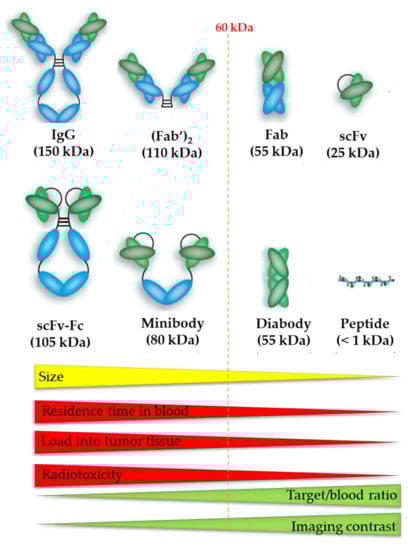 The size of the vector molecule determines the residence time of blood, tumor accumulation, radiotoxicity, target-to-blood ratio, and imaging contrast of the radiopharmaceutical. Image was adapted from Hong H. et al., 2008 and modified with permission from [79], SAGE Journals, 2008.
