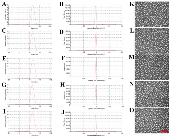 The sizes of the unmodified and modified GA/PTX-NLC were approximately 20 nm with PDI ≤ 0.25, and the ZP ranges −2.78 to −4.01 mV (as shown in Table 1), which suggested an acceptable particle size distribution of NLCs. The size distribution of NLCs is suitable for the targeted therapy of breast cancer [7]. The typical particle size distribution and ZP for the different GA/PTX-NLC are shown in Figure 1A–J. The morphological characteristics of the different NLCs were evaluated using TEM. The morphological results showed that all of the NLCs tested in this research are spherical with a uniform particle size (Figure 1K–O).