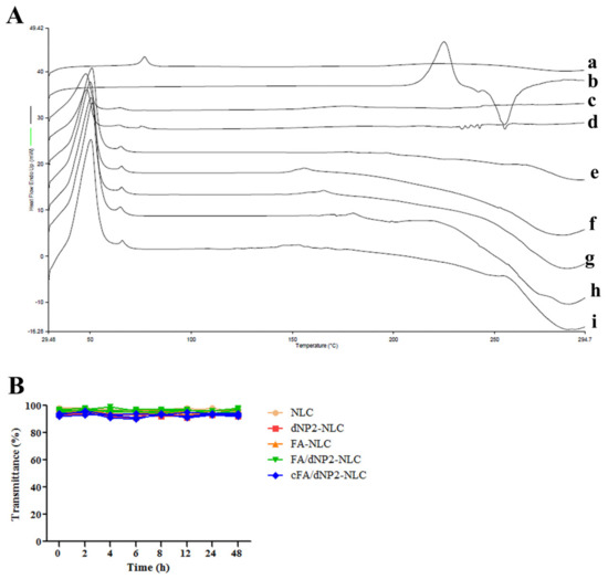 (A) Differential scanning calorimetry (DSC) of different formulations (a: GA, b: PTX, c: Blank-NLC, d: the physical mixture of NLC’s formulation and GA + PTX, e: GA/PTX-NLC, f: dNP2-GA/PTX-NLC, g: FA-GA/PTX-NLC, h: FA/dNP2-GA/PTX-NLC, i: cFA/dNP2-GA/PTX-NLC). (B) The variations of transmittance of NLCs in 50% Fetal Bovine Serum (FBS) over 48 h (mean ± SD, n = 3).