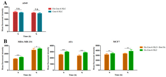 (A) The cellular fluorescence intensity of Cou-6-NLC and FA modified Cou-6-NLC at different incubation time intervals (4 h, 8 h) in A549 cells. (B) Blocking experiment after pretreatment with excess FA. * p < 0.05; ** p < 0.01; *** p < 0.001; n.s., not significant. Results are expressed as mean ± SD, n = 3.