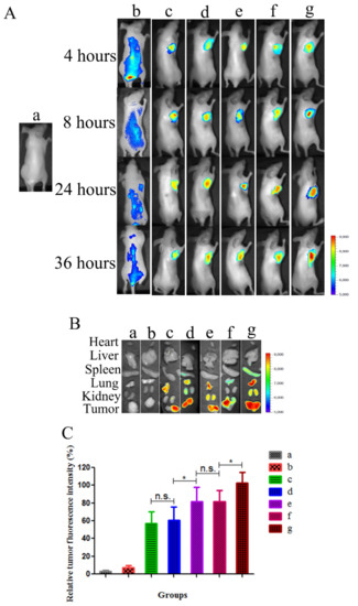 Bio-distribution study of modified DiR-NLC in tumor-bearing mice. (A) Fluorescence images of mice treated with different DiR formulations in vivo at different time points (4, 8, 24, and 36 h). (B) Ex vivo fluorescence images of the organs and tumor tissues excised from mice treated with different DiR formulations. (C) Fluorescence signal of tumor obtained from mice treated with different DiR formulations. Results are expressed as mean ± SD, * p < 0.05. n.s., not significant. In Figure 6, a: Sal, b: DiR-Sol, c: DiR-NLC, d: dNP2-DiR-NLC, e: FA-DiR-NLC, f: FA/dNP2-DiR-6-NLC and g: cFA/dNP2-DiR-NLC.